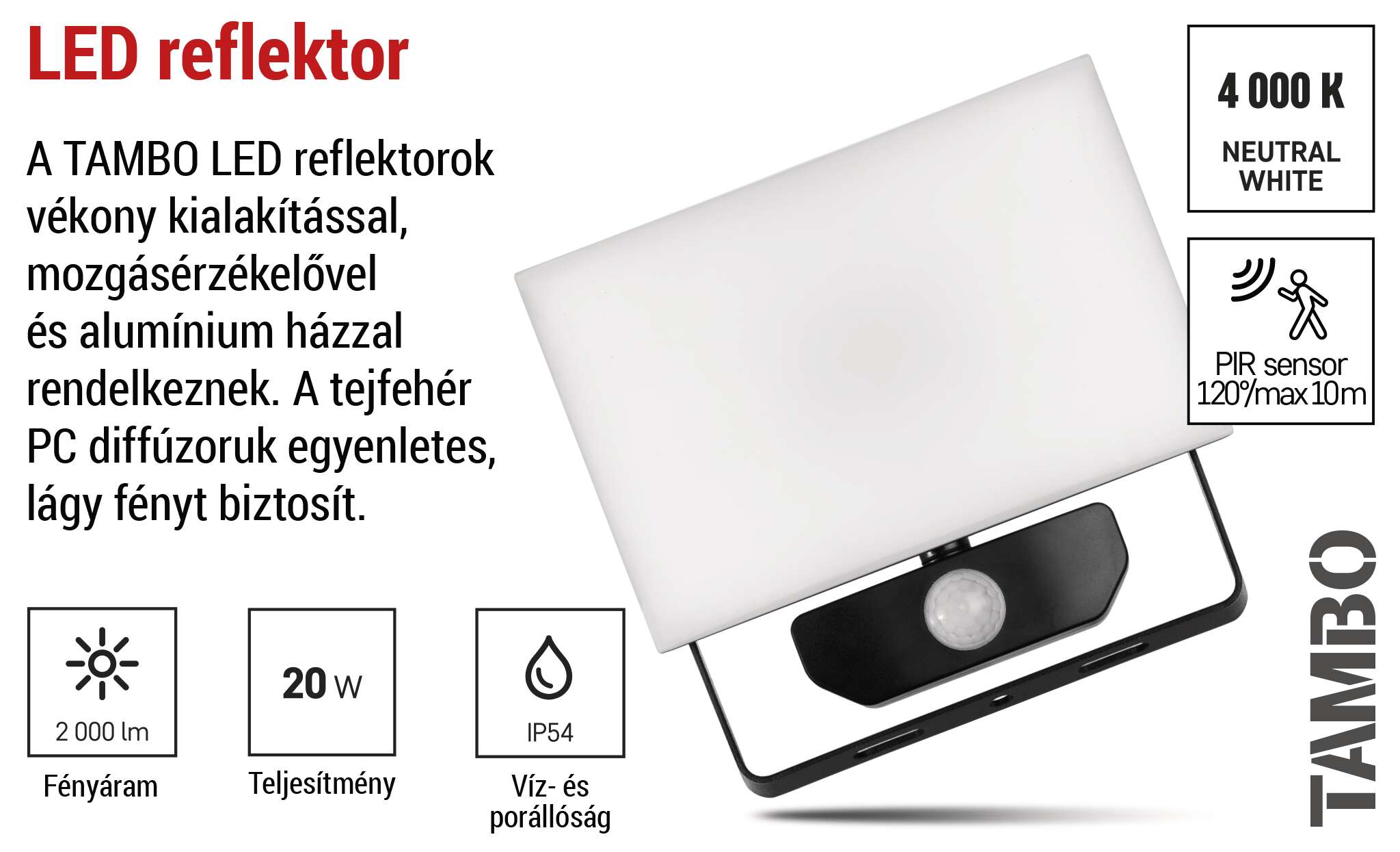 LED-es reflektor TAMBO mozgásérzékelővel, 20 W, 2000 lm, fekete