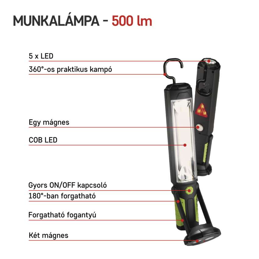 Univerzális, műanyag, újratölthető COB LED-es munkalámpa otthonra, a műhelybe vagy bárhová, ahol nagyobb területet kell megvilágítani.A lámpa figyelmeztető LED-háromszöggel, praktikus kampóval és mágnessel rendelkezik a felakasztáshoz és hálózati adapterrel az autós és a hagyományos aljzathoz.