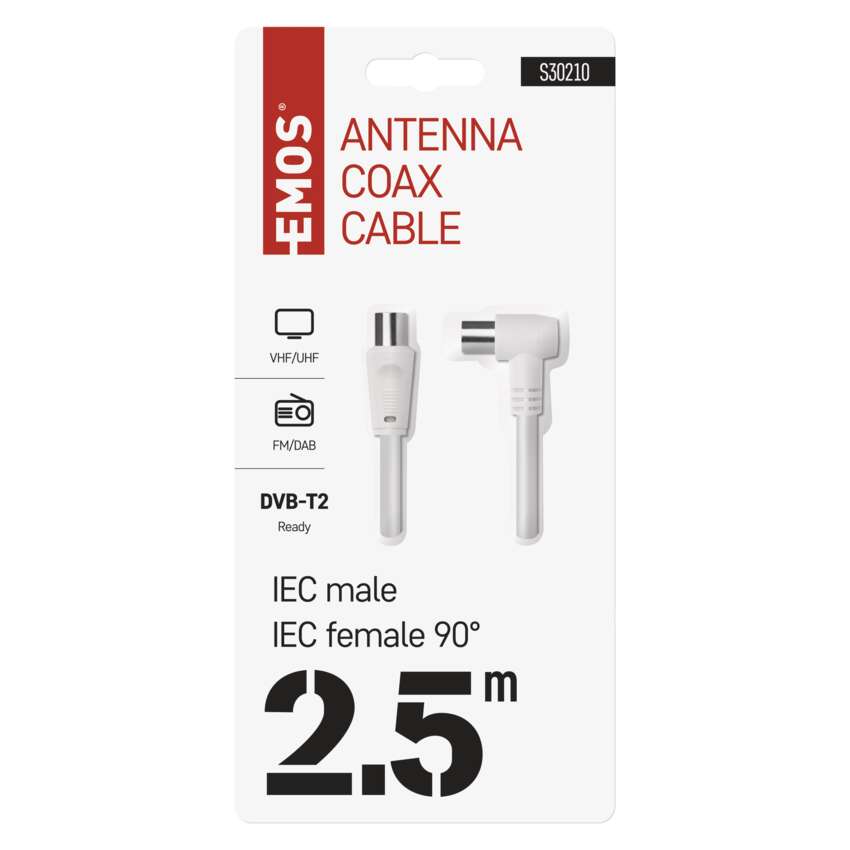 Koaxiális antennakábel IEC csatlakozódugóval és csatlakozóhüvellyel. A kábel 90°-os hajlított csatlakozóval rendelkezik. A kábel kettős árnyékolású az elektromágneses interferencia csökkentése érdekében. 2,5 m-es kábelhossz.A koaxiális kábel használható műholdvevőhöz, digitális vevőkészülékhez, antennához, átalakítóhoz, síkképernyős tévéhez és hagyományos televízióhoz.