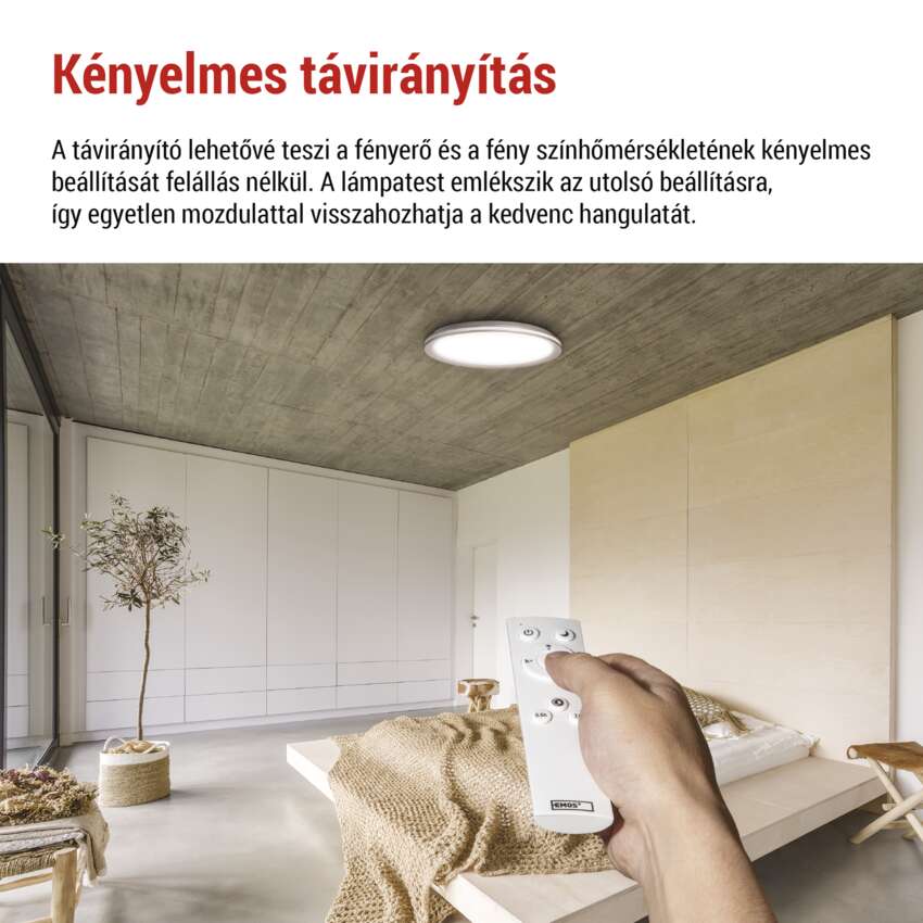 Egyszerűen válthat a meleg és a hideg fehér között, zökkenőmentesen tompítva, hogy minden pillanatban tökéletes hangulatot teremtsen - a nyugodt esti pihenéstől a koncentrált munkáig. Ráadásul a memóriafunkcióval elmentheti a legutóbbi beállításait vagy egy kedvenc jelenetét, így a fény mindig az Ön preferenciáihoz igazodik. A távirányító teljesen intuitívvá és kényelmessé teszi a lámpatest mindennapi használatát, és a helyiség azonnal tökéletes hangulatot kap.