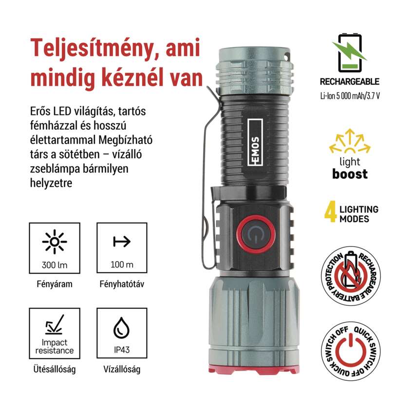 EMOS LED tölthető fém zseblámpa 300 lm, 700 mAh