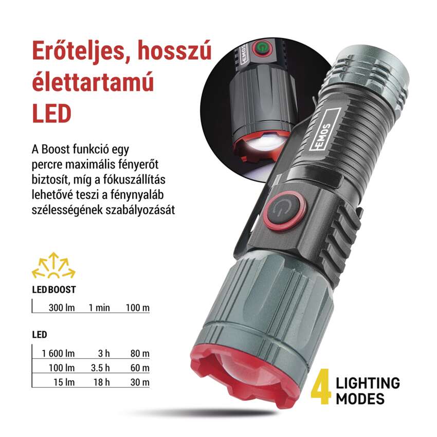 | üzemmódok | LED BOOST, LED 100 %, LED 50 %, LED 10 % |