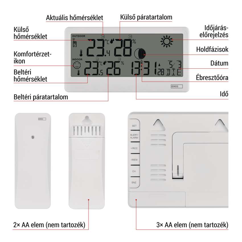 Az időjárásállomás támogatja a naptárat cseh, lengyel, magyar és 12 másik nyelven. A nagyméretű tiszta kijelző könnyen leolvashatóvá teszi, és az asztalra vagy falra szerelhető opció lehetővé teszi, hogy bárhol elhelyezze. A készülék 3× AA elemmel működik, amelyek nem tartoznak a készülékhez.