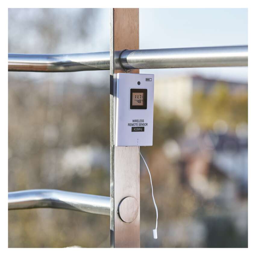 A szükséges értékeket egy érzékelő szolgáltatja, amelynek hatótávolsága legfeljebb 50 méter. Összesen legfeljebb 3 érzékelő használható. Így áttekintheti a hőmérsékletet a különböző helyeken, például a pincében, a télikertben, a padláson stb. Van egy barométer is, amely a légnyomásról szolgáltat adatokat.