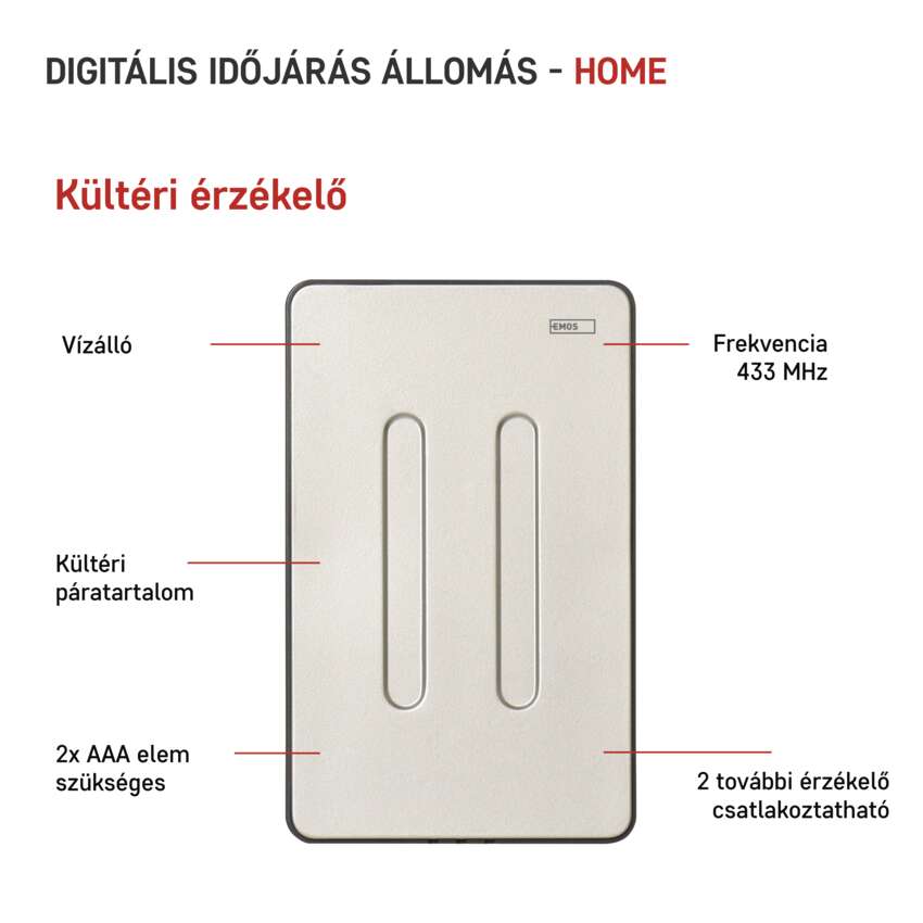 Az EMOS időjárás-állomás további előnyei közé tartozik a beltéri és kültéri páratartalom, a hőmérsékleti és nyomás-trend, továbbá a Hold fázisainak megjelenítése, valamint a barométer, amely a légköri nyomásról ad tájékoztatást. Megbízhatunk a hőmérsékleti riasztás valamint a magasságkorrekció funkciókban is.