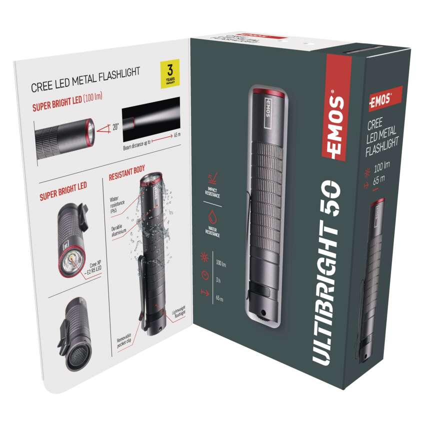 Az Ultibright 50 LED zseblámpa sosem hagyja Önt cserben. Legyen akár a természetben, út közben autóval, vagy a munkahelyén, ha gyorsan meg kell világítania egy rosszul hozzáférhető helyet, a vízálló IP65-ös védettségű zseblámpa pontosan az, amire szüksége van. És ha hozzátesszük, hogy ütésálló, így ha kemény felületre ejti, azzal sem tesz kárt benne, akkor előre borítékolható, hogy az EMOS Ultibright 50 zseblámpát Ön is meg fogja szeretni.