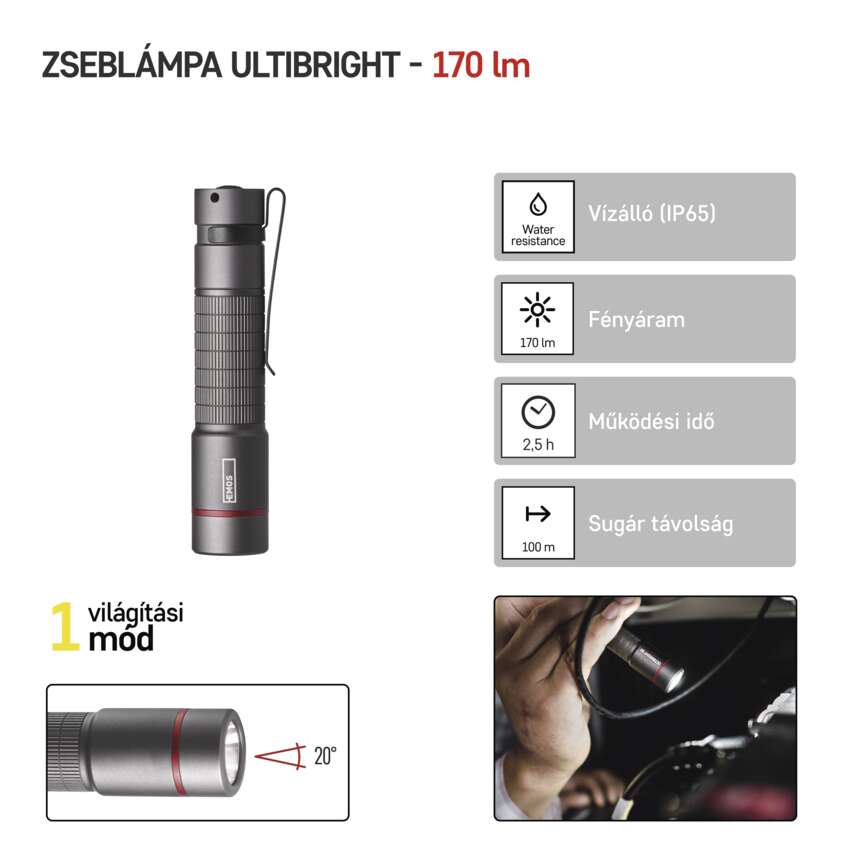 Az EMOS Ultibright 60 zseblámpa mindig a keze ügyében lehet. Köszönhetően annak, hogy csak kicsit vastagabb, mint egy AA elem, a hossza pedig kevesebb, mint 10 cm, ezért rendkívül kompakt és könnyű. Minden zsebben, táskában, vagy ridikülben elfér.