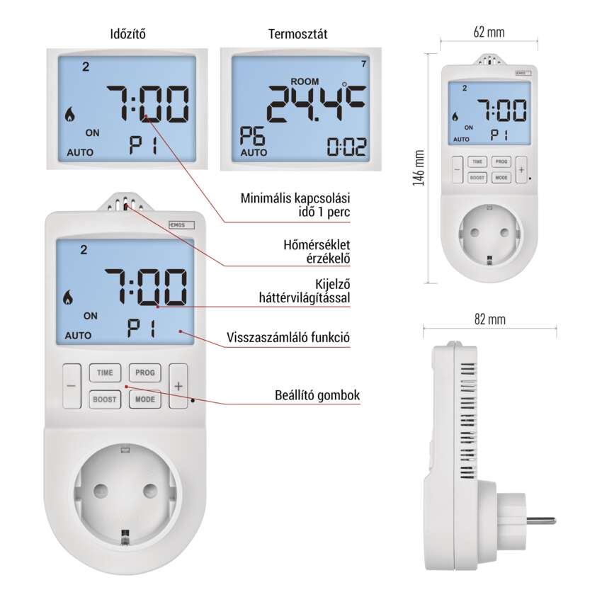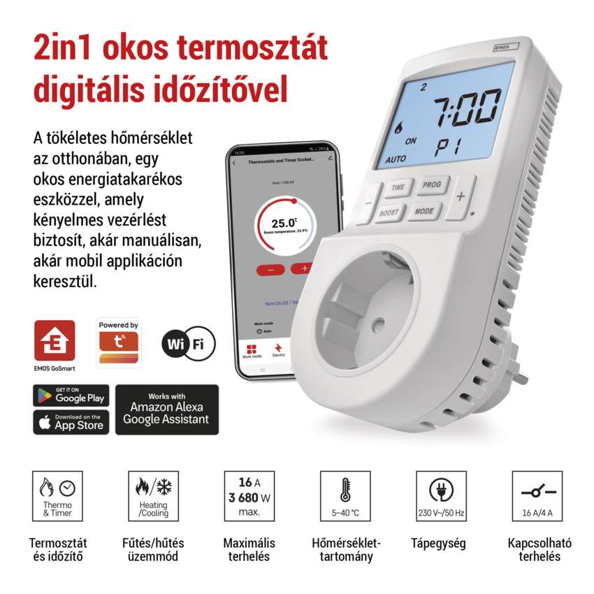 GoSmart 2 az 1-ben konnektoros, digitális termosztát időzítő funkcióval, schuko, WiFi