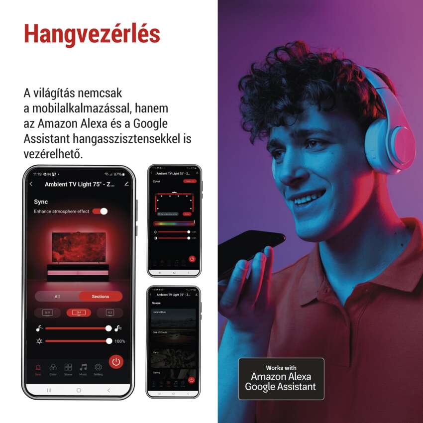 A GoSmart Ambient LED TV Lighting a tévénézés élményét egy teljesen új szintre emeli. A HD szinkronizáló kamerának köszönhetően a háttérvilágítás automatikusan igazodik a képernyő színeihez, tökéletes vizuális hatást teremtve. Minden vezérlés és beállítás az EMOS GoSmart mobilalkalmazáson keresztül történik, amely Android és iOS rendszerre egyaránt elérhető.