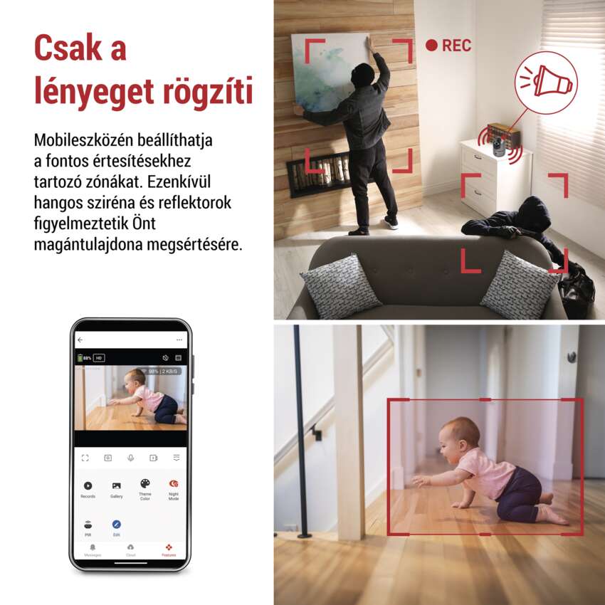 Így akár 4 előre beállított megfigyelési pontot is kiválaszthat. A mobil értesítések pedig azonnal figyelmeztetik Önt az otthonában történtekről – bárhol is legyen. A felvételek SD-kártyára vagy felhőbe kerülnek, így nem veszítheti el a fontos videókat.