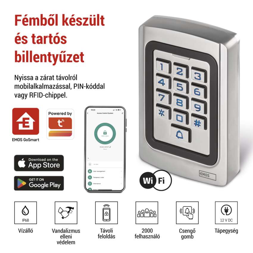 Kapcsolja a billentyűzetet az Wi-Fi hálózatához, csatlakoztassa egy elektronikus zárhoz (pl. C0030) és párosítsa az EMOS GoSmart mobilalkalmazással, amely Android és iOS operációs rendszerekhez érhető el. A Wi-Fi protokollnak köszönhetően, amely egy router segítségével csatlakozik az internethez, megvalósíthatja az eszközök távvezérlését és felügyeletét.