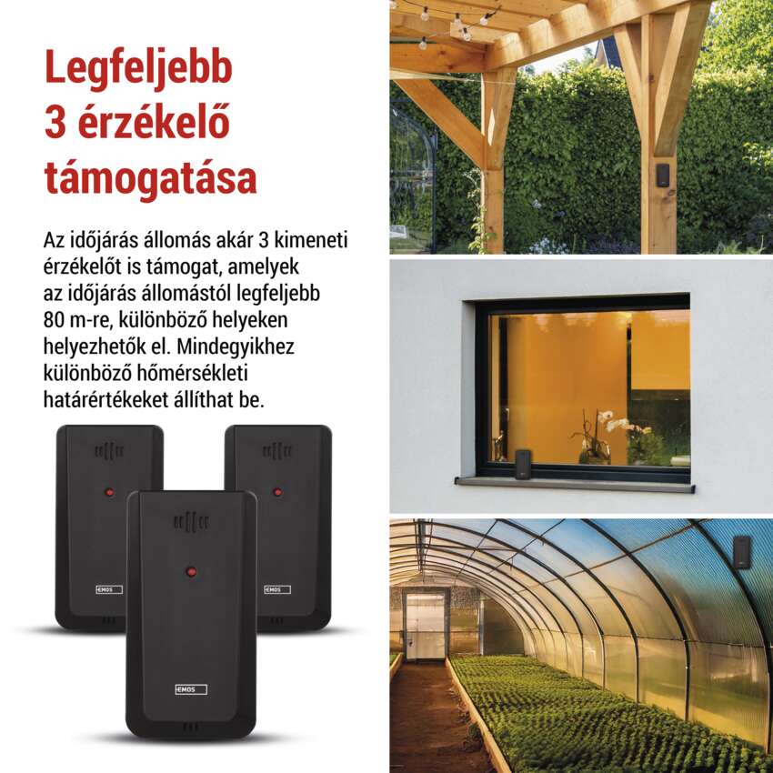 Az okos időjárásállomás nagy előnye, hogy 3 kimeneti érzékelőt támogat, amelyek 3 különböző helyen helyezhetők el. Egy külső érzékelőt tartalmaz, és mind beltéren, mind kültéren elhelyezhető. Az érzékelők hatótávolsága a főállomástól legfeljebb 80 m, és 2×1,5 V-os AAA elemekkel működnek, amelyek nem tartoznak a csomaghoz. Figyelje például az üvegházban vagy a borospincében a hőmérsékletet vagy a páratartalmat.