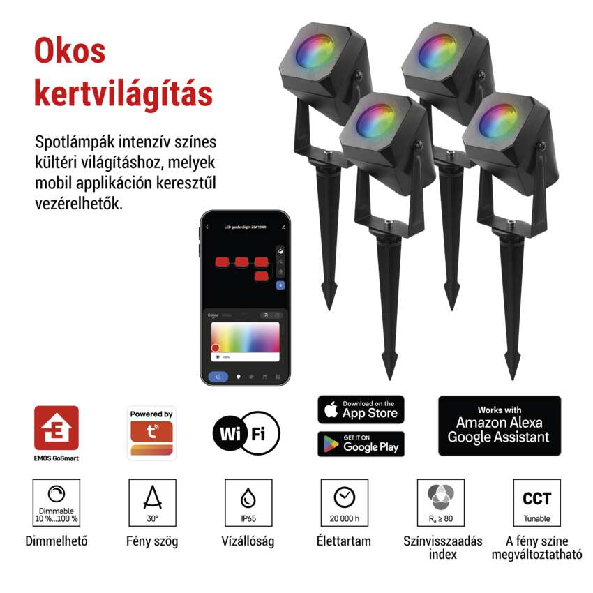 A reflektorok elhelyezése gyors és rugalmas - a dugós tüskéknek köszönhetően egyszerűen oda ültetheti őket, ahol egy adott elemet meg kell világítania - legyen az egy fa, bokor, homlokzat vagy feljáró. A csatlakoztatás után a lámpák automatikusan csatlakoznak a Wi-Fi hálózathoz, és minden beállításuk és vezérlésük kényelmesen kezelhető a mobilalkalmazáson keresztül. Az akár 20.000 órás élettartamnak és az IP65 ellenállásnak köszönhetően nem kell aggódnia az eső, a hó vagy a poros környezet miatt - a lámpák bármilyen időjárási körülmények között és egész évben megbízhatóan működnek.