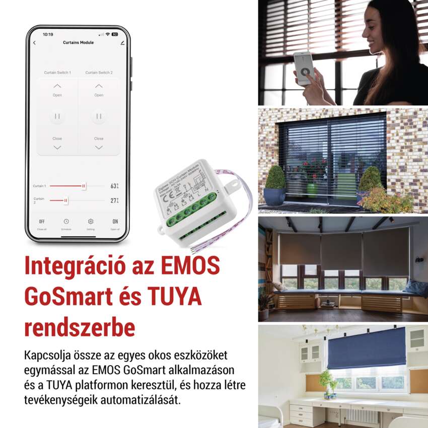 Az okos modul csatlakoztatható otthonában található egyéb eszközökhöz, például órákhoz, világításhoz, ajtó és ablakérzékelőkhöz, valamint fűtésérzékelőkhöz. Az EMOS GoSmart mobilalkalmazással egyszerűen párosíthatja őket, automatizálhatja működésüket, létrehozhat forgatókönyveket, és időbeosztást állíthat be a készülékekhez. Például a redőnyök lehúzásával időzítheti az ébredését, vagy előre beütemezett időpontban automatikusan sötétítheti az ablakokat távolléte alatt. Hozzon létre egy okos otthont, amely igazodik az Ön életstílusához.