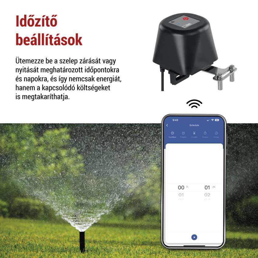 - időzítő funkció lehetővé teszi a szelep nyitásának/zárásának ütemezését