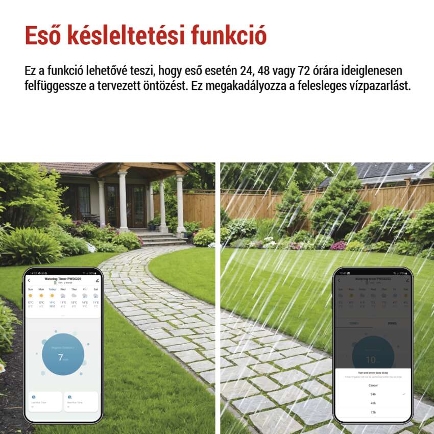 Az esőkésleltető funkció biztosítja, hogy kertjét ne öntözzük feleslegesen túl, és ezzel vizet és költségeket takarít meg. Az EMOS okos öntözőóra lehetővé teszi, hogy mindig kézben tartsa kertje öntözését, még akkor is, ha az időjárás váratlanul megváltoztatja terveit.