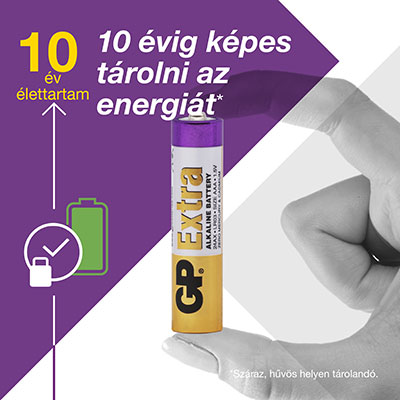 A GP EXTRA terméksorának elemei nagyszerű tartalék energiaforrásként szolgálnak. A hagyományos egyszer használatos elemekkel ellentétben, amelyek legfeljebb 5 évig tárolhatók, a GP EXTRA AAA elemeket arra tervezték, hogy még öt évvel tovább megőrizzék maximális energiájukat. Így tíz év tárolás után sem kell aggódnunk az elégtelen üzemidő miatt.