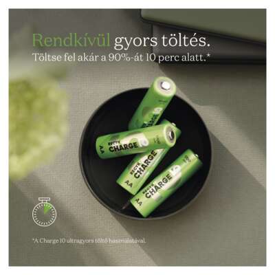 Ismered azt az érzést, amikor úton vagy, felkapod a készülékedet, és hirtelen rájössz, hogy lemerült az akkumulátorod? A Recyko Charge 10 AA elemekkel ez nem probléma. Csak helyezze be őket a GP Charge 10 töltőbe, és csak 10 perc múlva máris teljes akkumulátorkapacitással indulhat útnak az úti cél felé.