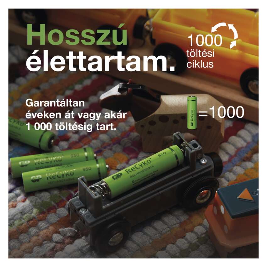 A GP ReCyko újratölthető elemeinek használata kényelmes, környezetbarát és költséghatékony. Az akkumulátorok ugyanis évekig kibírják teljesítménycsökkenés nélkül. Még 1000 töltés és merítés után is megtartják kapacitásuk nagy részét. Ezáltal jelentős összegű megtakarítás érhető el az egységnyi idő alatt kiváltott eldobható elemek révén.
