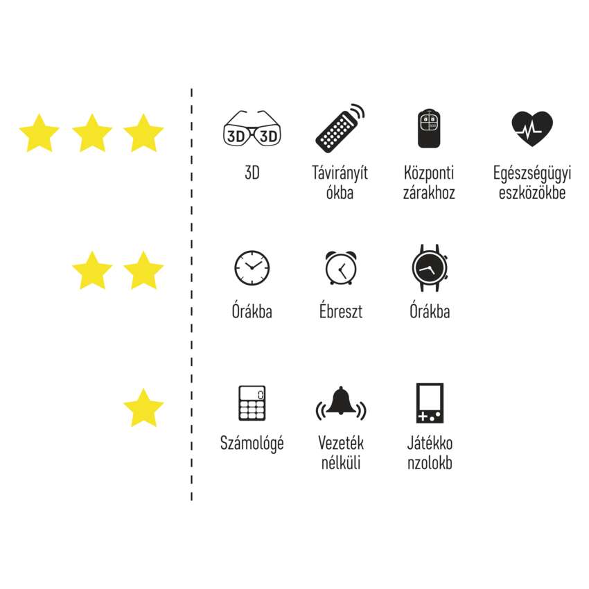 Különösen széles, -10 °C és +60 °C közötti működési hőmérséklet-tartomány. Megfelel az érzékeny eszközökben történő használatra, mint például: karórák, számológépek, biztonsági világítás, gépkocsiriasztók, nyomásmérők, távirányítók és egyebek. Különösen hosszú, akár 10 éves eltarthatósági idő.