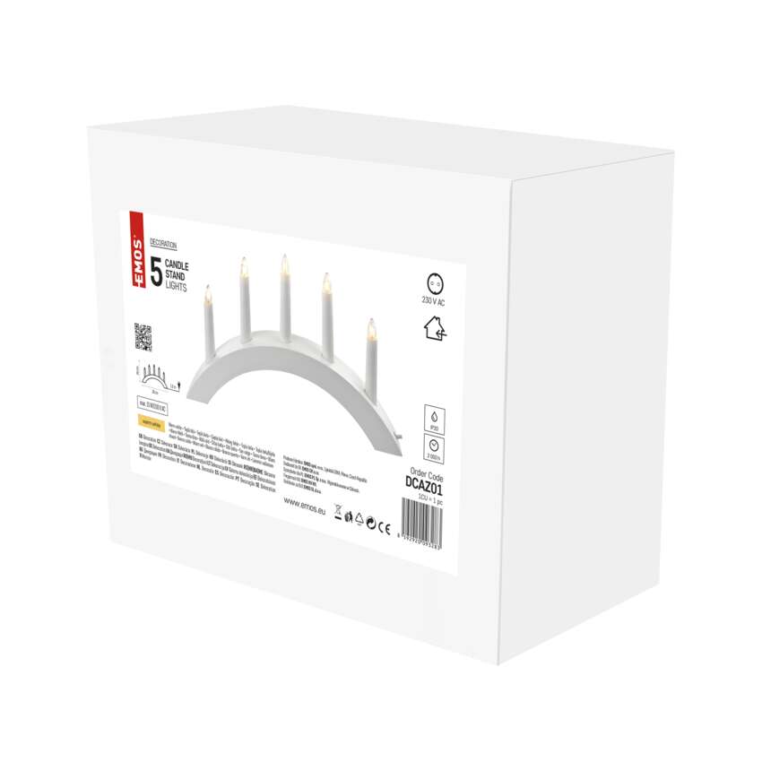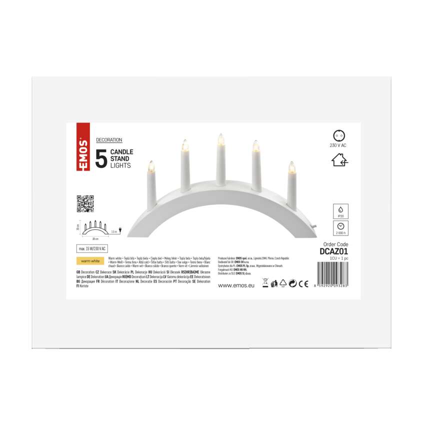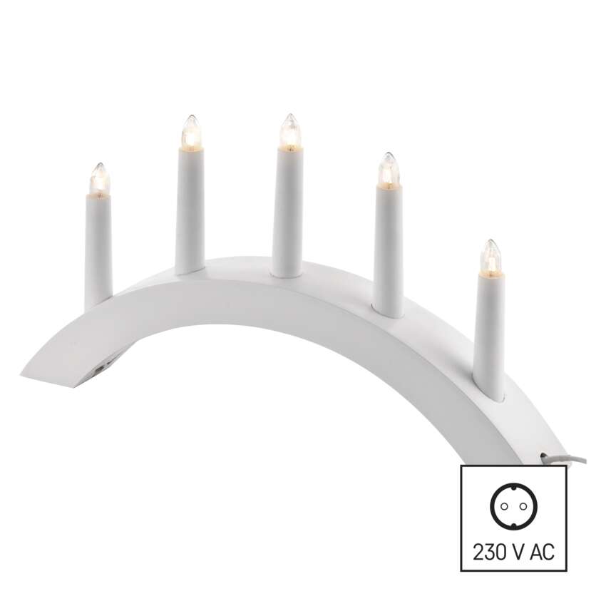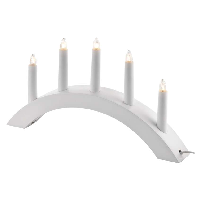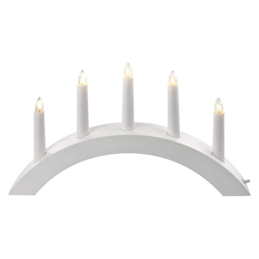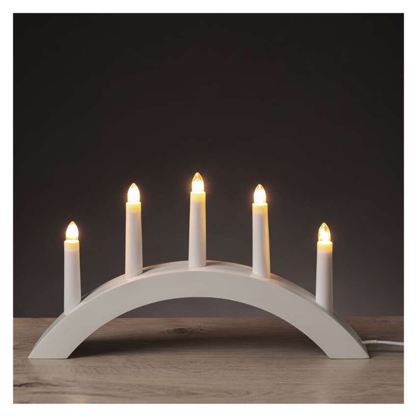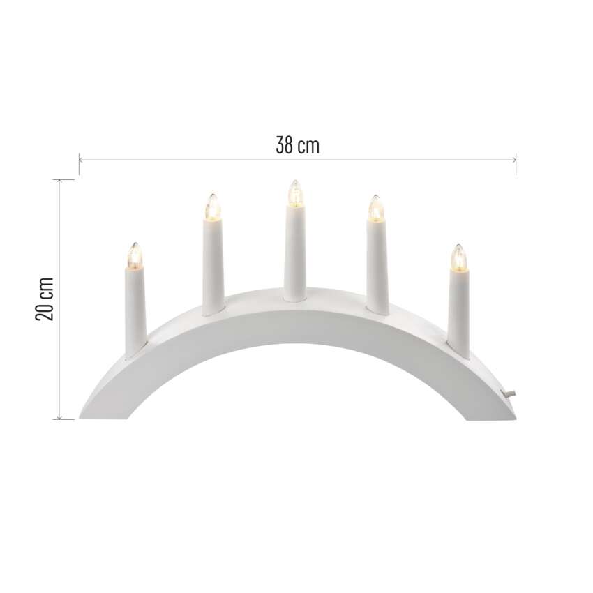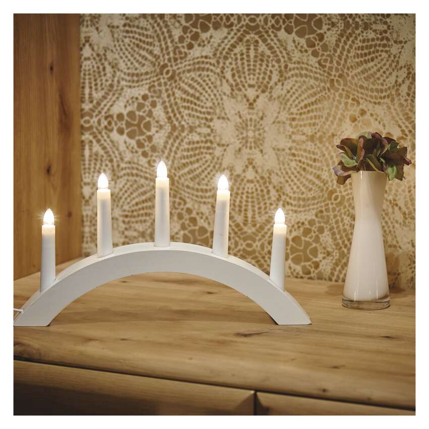 Gyertyatartó 5 db E10 izzóval, fa, fehér, ívelt, 20x38 cm, beltéri, meleg fehér