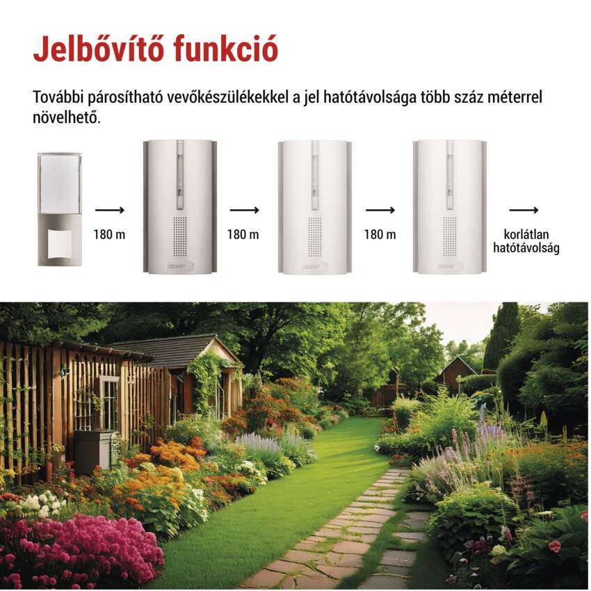 Kertbe, garázsba vagy egy távoli kapuhoz szeretné eljuttatni a kapucsengő jelét? Az EMOS P5763RN vezeték nélküli hosszabbítóval mindezt megteheti kábelek húzása nélkül. Ez az okos vevő nem csak a nyomógomb hatótávolságát növeli meg akár több száz méterrel, de még nehéz körülmények között is stabil és megbízható kapcsolatot tart fenn.