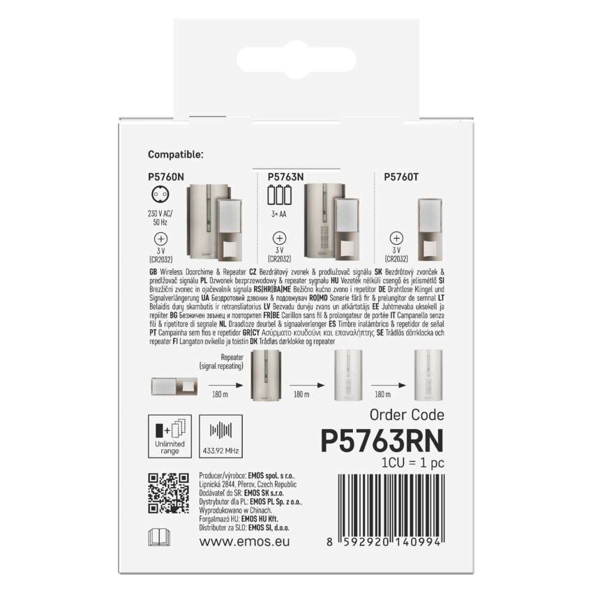 AzEMOS P5763RN fogadja a csengőgomb (pl. P5760T) jelét, és egyidejűleg megismétli azt. Így ismétlőként szolgál, hatékonyan kiterjesztve a teljes csengőrendszer lefedettségét. Az EMOS P5760N és P5763N sorozatú ajtócsengőkkel kombinálva akár 8 különböző gombot is hozzáadhat.