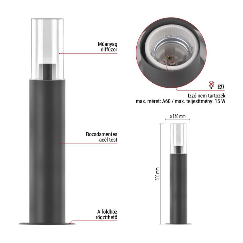 Kerti oszloplámpa ZALA, 14 x 14 x 50 cm, 1 x E27, 15 W