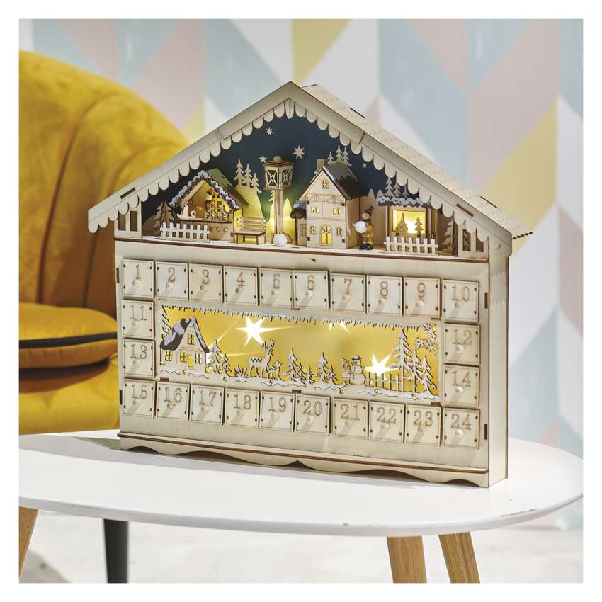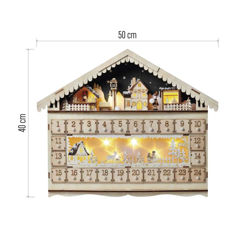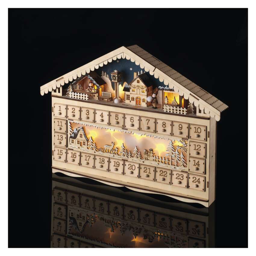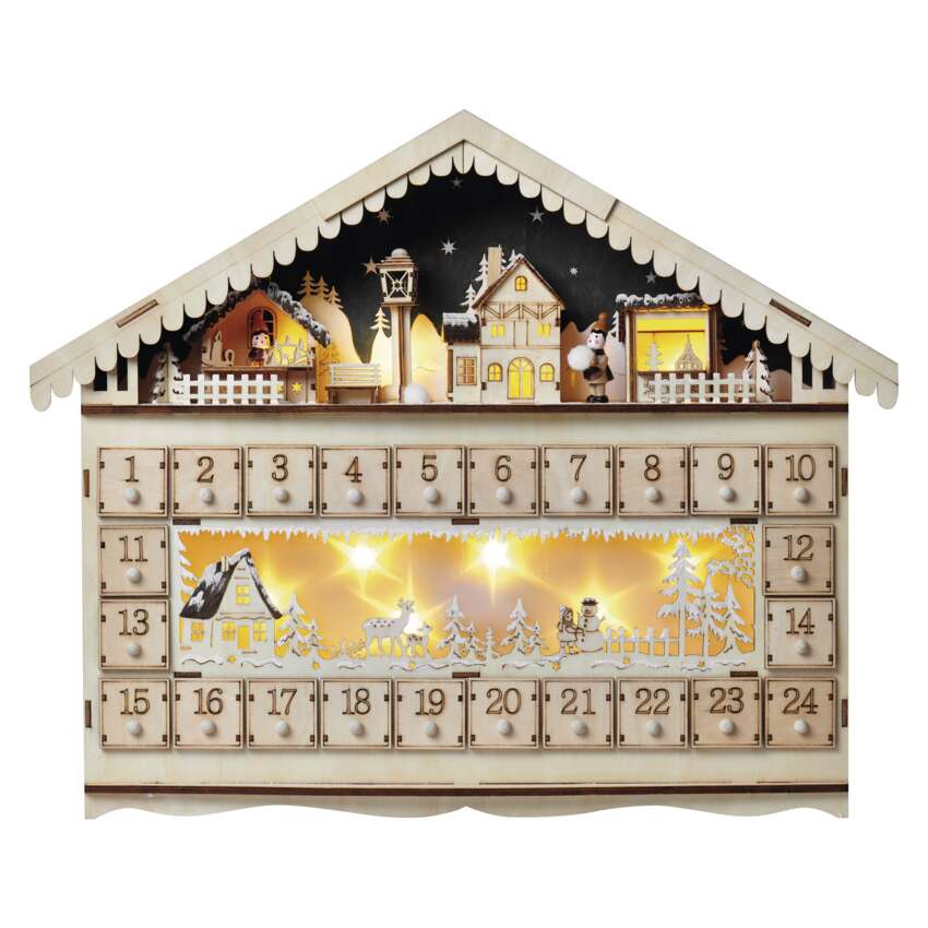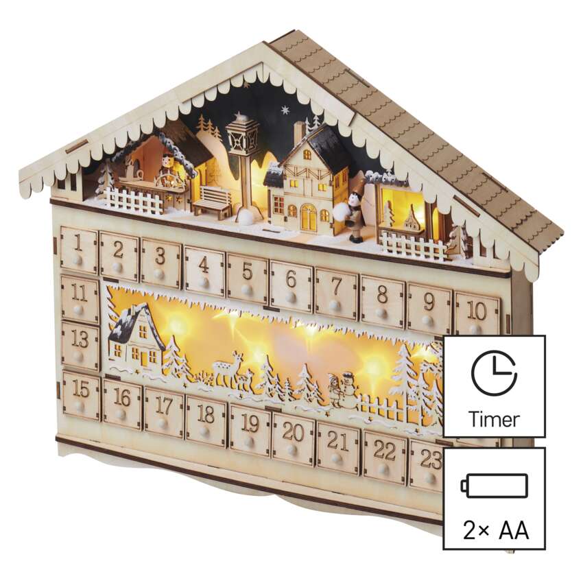 Az adventi és karácsonyi készülődés nem nélkülözheti a népszerű adventi naptárat, amelyet különösen a gyerekek szeretnek. Számold vissza a szentestéig hátralévő 24 napot a kellemes meleg fehér fényt adó adventi naptárral. Az A AA elemes tápellátásnak köszönhetően a belső térben mindenhol elhelyezhető. Különösen jól mutat egy ablakpárkányon, komódon vagy tévéasztalon, és segít a karácsonyi hangulat finomhangolásában. Ha a naptár minden napjához egy kis édességet vagy ajándékot adsz, akkor magadnak és gyermekeidnek is kedves mindennapi meglepetést szerezhetsz.