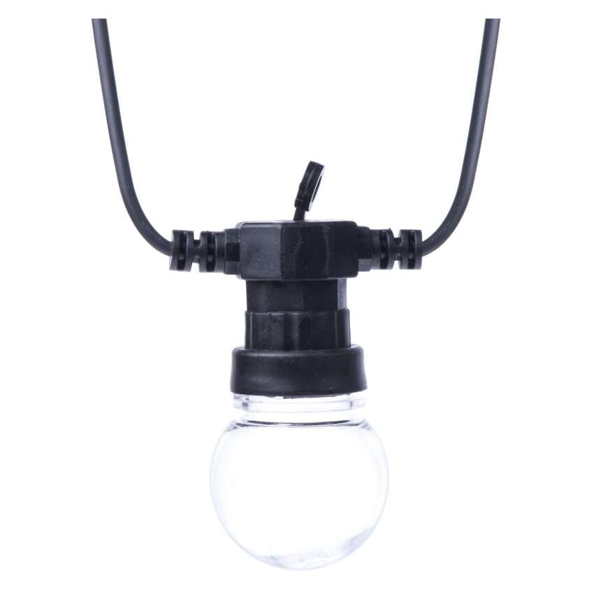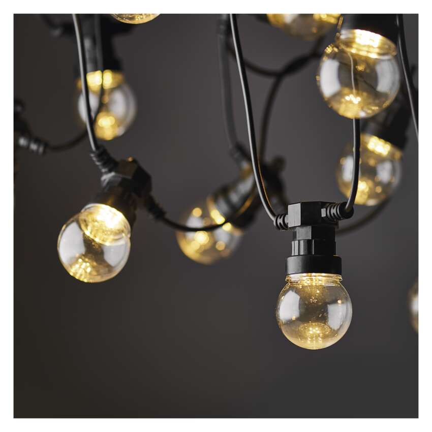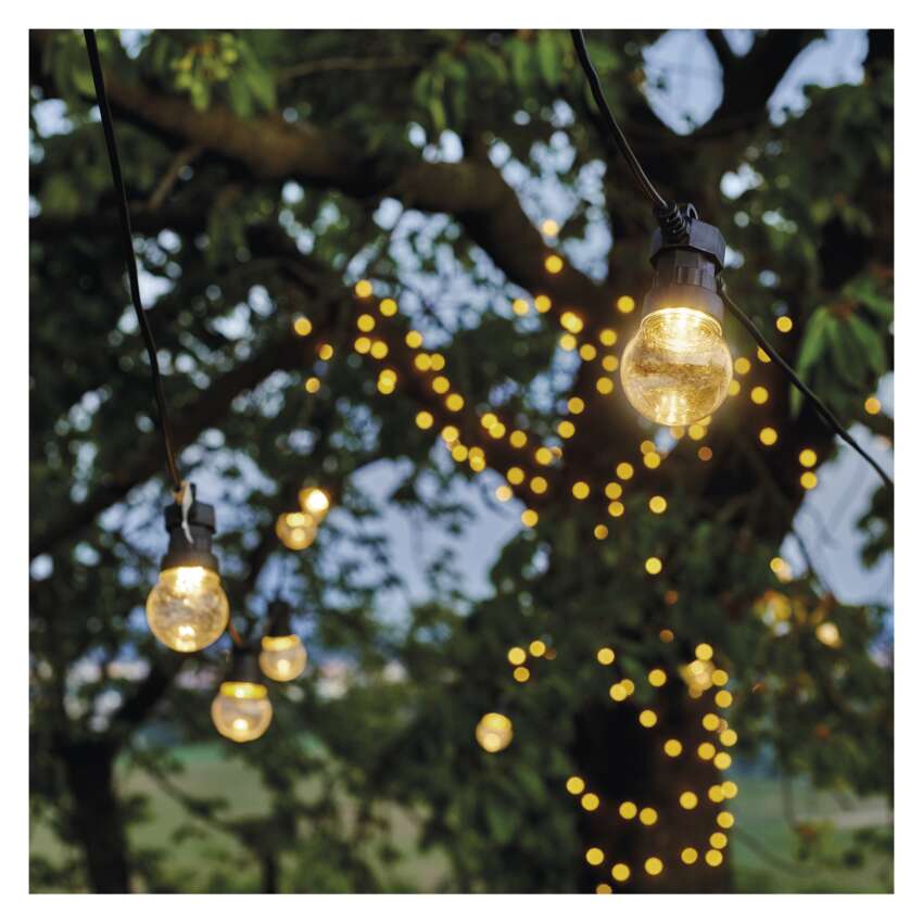A kültéri fénylánc party izzókkal, amelyek meleg fehér színben ragyognak, hangulatos hangulatot kölcsönöz az erkélyen, teraszon, szabadtéri partikon, esküvőkön, kulturális rendezvényeken stb. ücsörgéskor. A megfelelő számú zsinórral és izzóval segítheti a hagyományos világítást, és minden napot különlegessé tehet. Ezt a fajta láncot egyre gyakrabban használják stílusvilágításként kertekben vagy éttermi belső terekben, ahol ízlésesen díszít egy egyébként hétköznapi teret. A hosszú, 5 m hosszú hálózati vezetéknek köszönhetően a hálózati csatlakoztatás gyerekjáték.