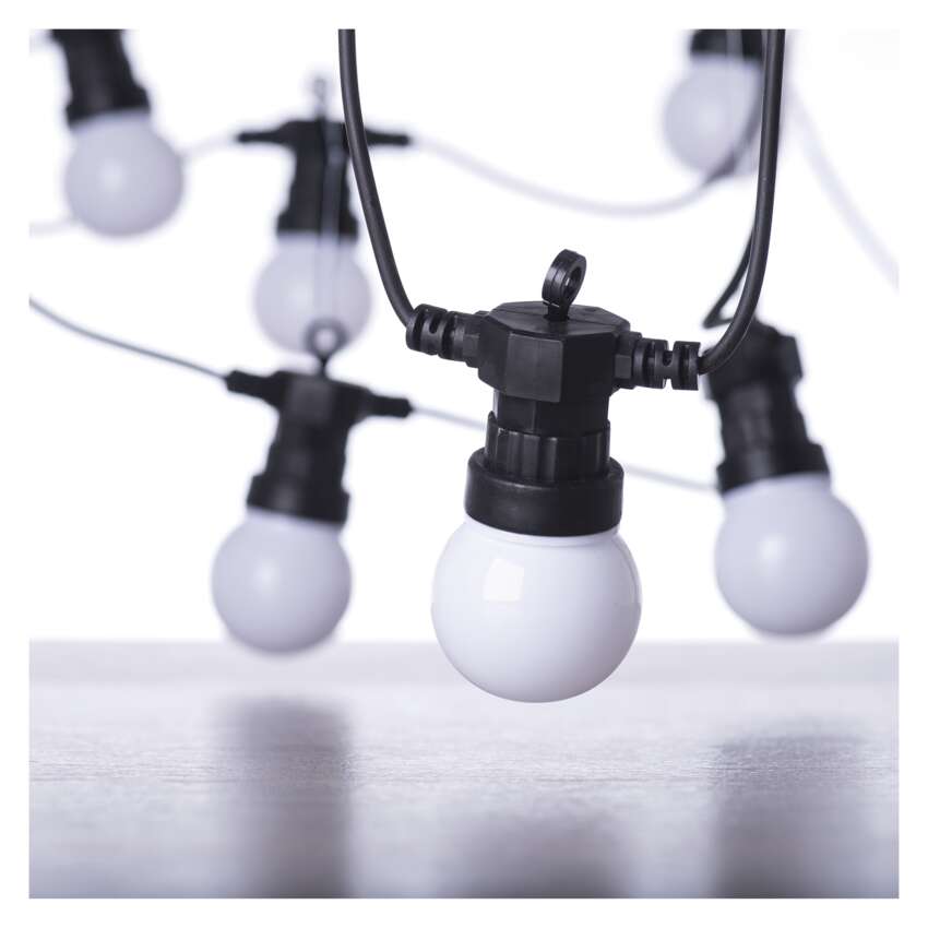 A kültéri fénylánc party izzókkal, amelyek meleg fehér színben ragyognak, hangulatos hangulatot kölcsönöz az erkélyen, teraszon, szabadtéri partikon, esküvőkön, kulturális rendezvényeken stb. ücsörgéskor. A megfelelő számú zsinórral és izzóval segítheti a hagyományos világítást, és minden napot különlegessé tehet. Ezt a fajta láncot egyre gyakrabban használják stílusos világításként kertekben vagy éttermi belső terekben, ahol ízlésesen díszít egy egyébként hétköznapi teret. A hosszú, 5 m hosszú hálózati vezetéknek köszönhetően a hálózati csatlakoztatás gyerekjáték.