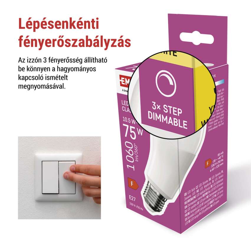 LED izzó Classic A60 / E27 / 10,5 W (75 W) / 1 060 lm / meleg fehér /fokozatos fényerősz.