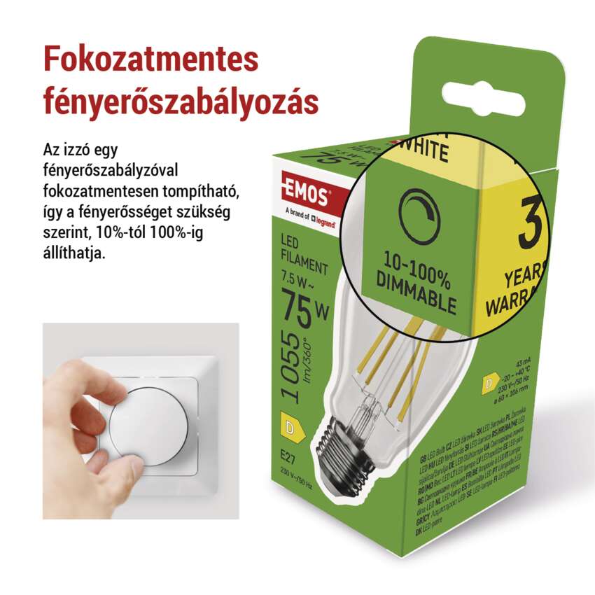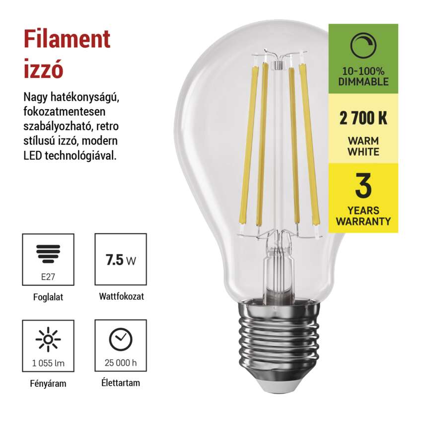 LED izzó Filament A60 / E27 / 7,5 W (75 W) / 1 055 lm / meleg fehér / dimmelhető