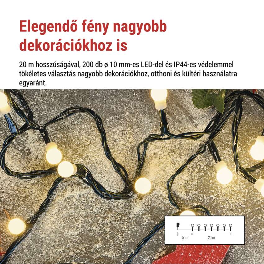 LED karácsonyi fényfüzér, cseresznye–golyók,20 m,kültéri és beltéri,meleg fehér,progr,időz