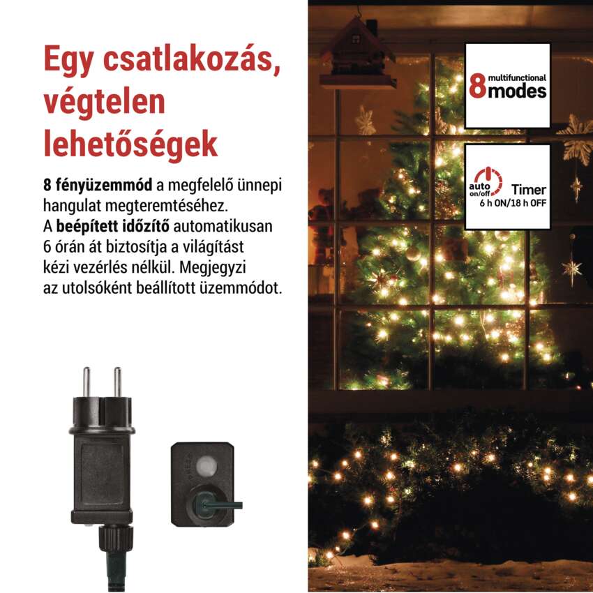 Nincs több kézi be- és kikapcsolás - a beépített időzítő mindent megtesz Ön helyett! Ha csatlakoztatod az aljzatba és az időzítőt aktiválod, a lánc 6 órán keresztül világít, majd automatikusan kikapcsol 18 órán keresztül, és a ciklus ismétlődik. A kényelem és az energiatakarékosság tökéletes kombinációja.