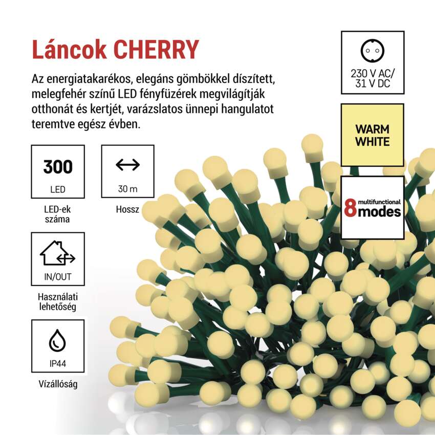 LED karácsonyi fényfüzér,cseresznye–golyók,30 m,kültéri és beltéri,meleg fehér,progr,időz