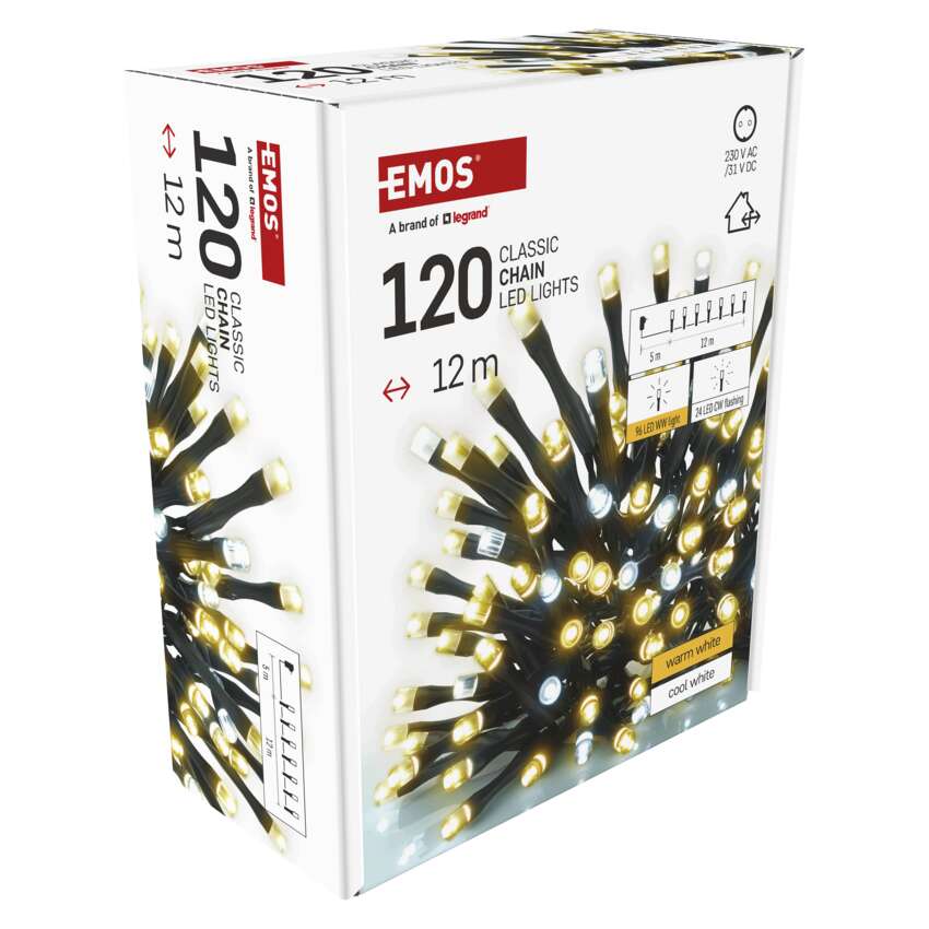 A CLASSIC LED-láncok az EMOS-tól többféle formában - klasszikus láncok, fürtök és cseppkövek - kaphatók. Elengedhetetlenek a megfelelő ünnepi hangulat megteremtéséhez. Nagyszerűen fognak kinézni egy hagyományos karácsonyfán, alkalmasak bútorok, korlátok, gerendák vagy ajtók díszítésére a belső térben.Kültéren is használhatja őket bokrok, fák, pergolák, pavilonok stb. megvilágítására.