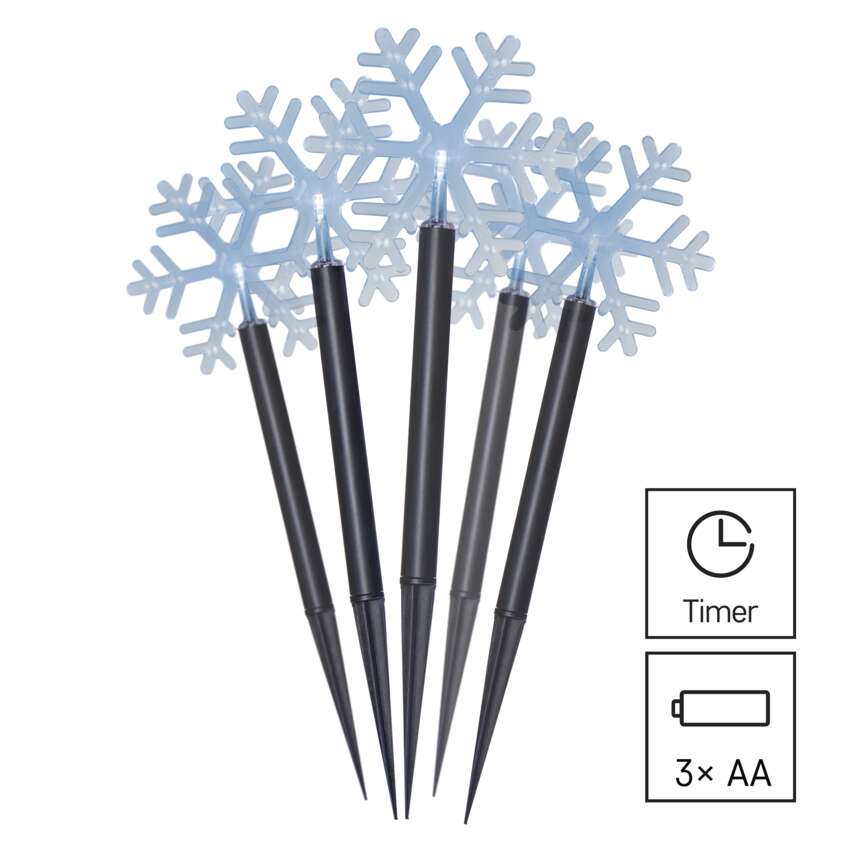 LED karácsonyi leszúrható hópelyhek, 35 cm, 3x AA, kültéri és beltéri, hideg fehér, időz.