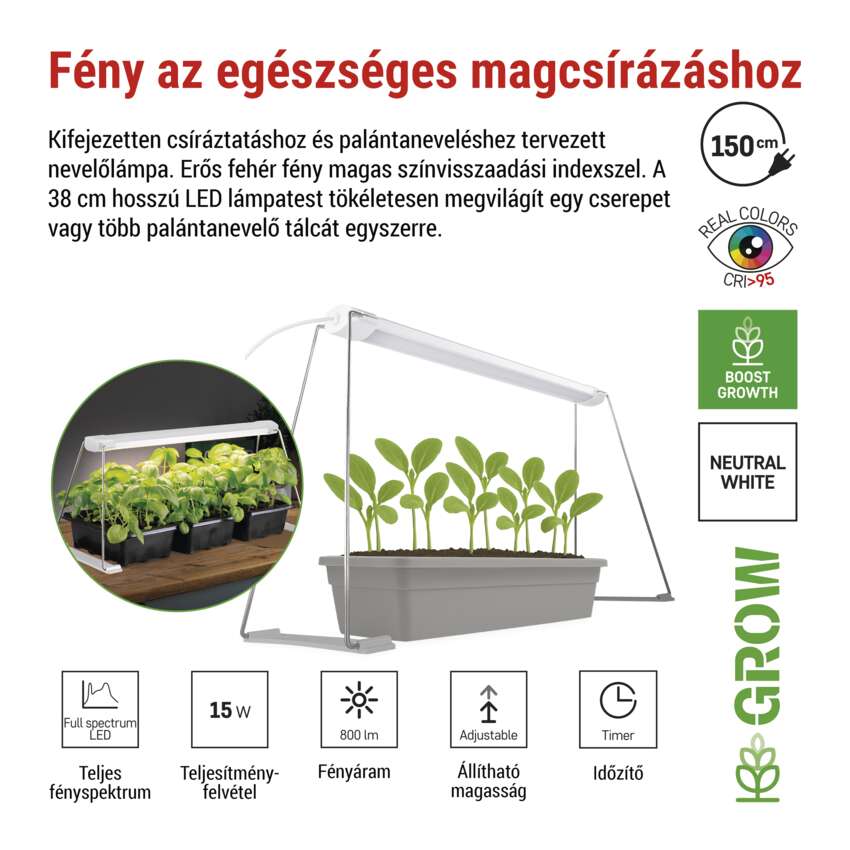 A 38 cm hosszú LED-panel lehetővé teszi a nagyobb termesztési terület egyenletes megvilágítását, így: