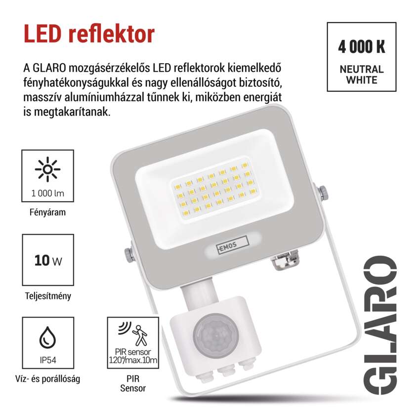 A GLARO LED-es reflektorok PIR-érzékelővel kényelmes és energiatakarékos kültéri világítást biztosítanak. A mozgás érzékelésekor történő automatikus kapcsolásnak köszönhetően csak akkor világítanak, amikor valóban szükség van rájuk - ideálisak a biztonság és a kényelem növelésére az ingatlanon. A reflektorok alkalmasak tető alá vagy épület falára történő felszerelésre, IP54-es védettséggel. Praktikus megoldást jelentenek bejáratok, garázsok, kerti utak, felhajtók és üzlethelyiségek megvilágítására. Az érzékelő érzékenységének és a fény időtartamának egyszerű beállítása lehetővé teszi az Ön igényeinek megfelelő testreszabást.