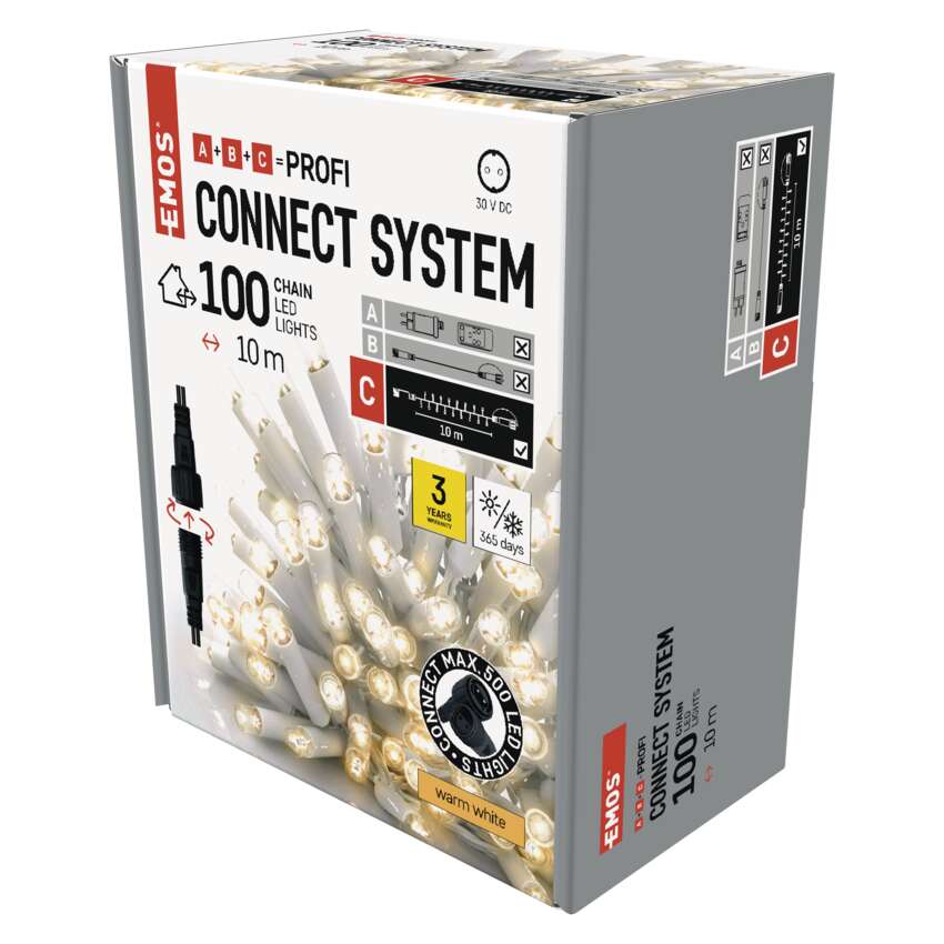 A CONNECT SYSTEM PROFI csatlakozórendszer IP44-es védettségének köszönhetően beltéri és kültéri használatra egyaránt alkalmas. Ez jellemzi a megnövelt anyagállóság és a meghosszabbított 3 éves garancia. A kiváló minőségű gumikábelek lehetővé teszik az egész éves telepítést anélkül, hogy bármilyen hőmérsékleti körülmények között szétszerelésre lenne szükség. Válasszon a szabványos láncok, léptetők és klaszterek közül. Egyetlen tápegységről(A) hosszabbító kábelekre, elosztókra(B) és LED fényelemek(C) akár 500 LED-lámpát is képesek ellátni .