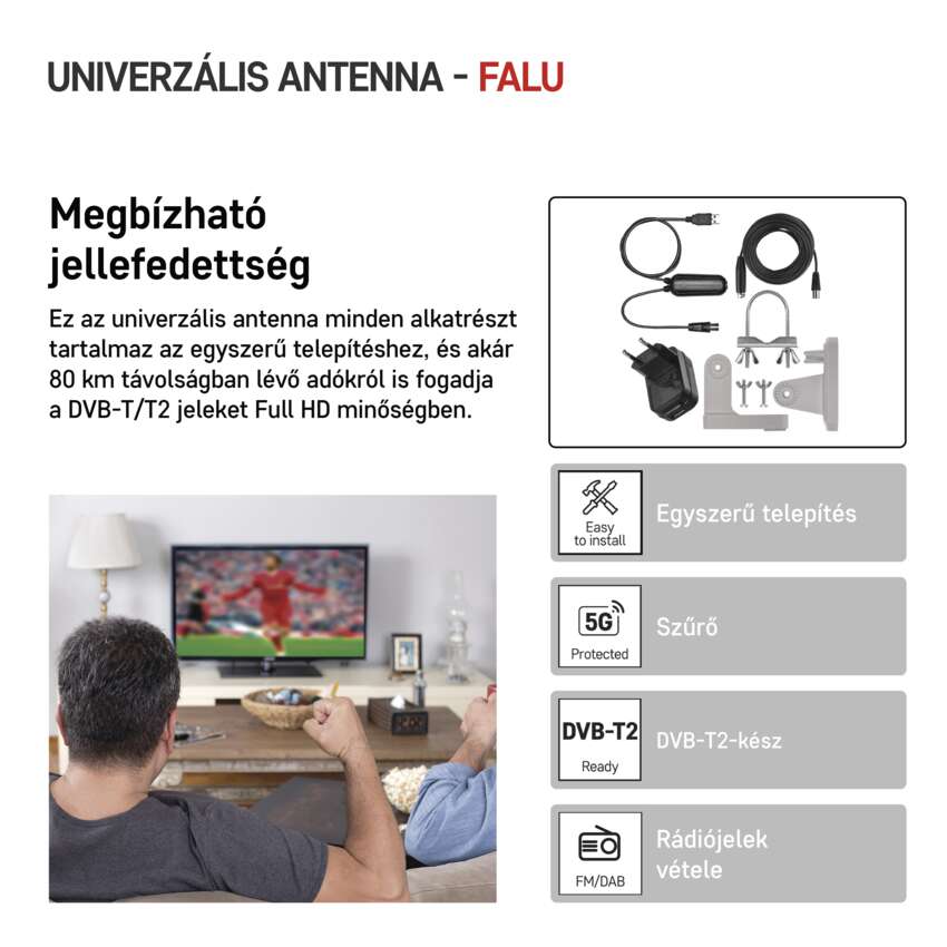 Falu: Az magas minőségű jel által lefedett helyekre szánt antennák. Ezek főként az úgynevezett univerzális antennák, amelyek a könnyű telepítéssel jeleskednek, ahol minden, ami a telepítéshez szükséges, közvetlenül a csomagban megtalálható. Az antennák kültéren és beltéren egyaránt felszerelhetők.
