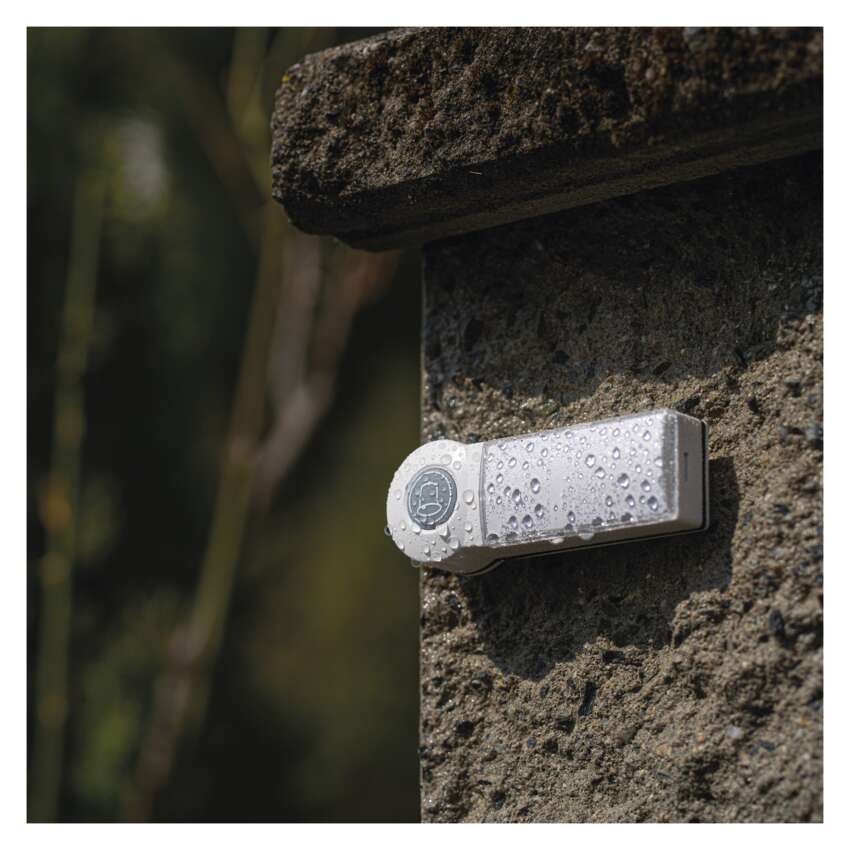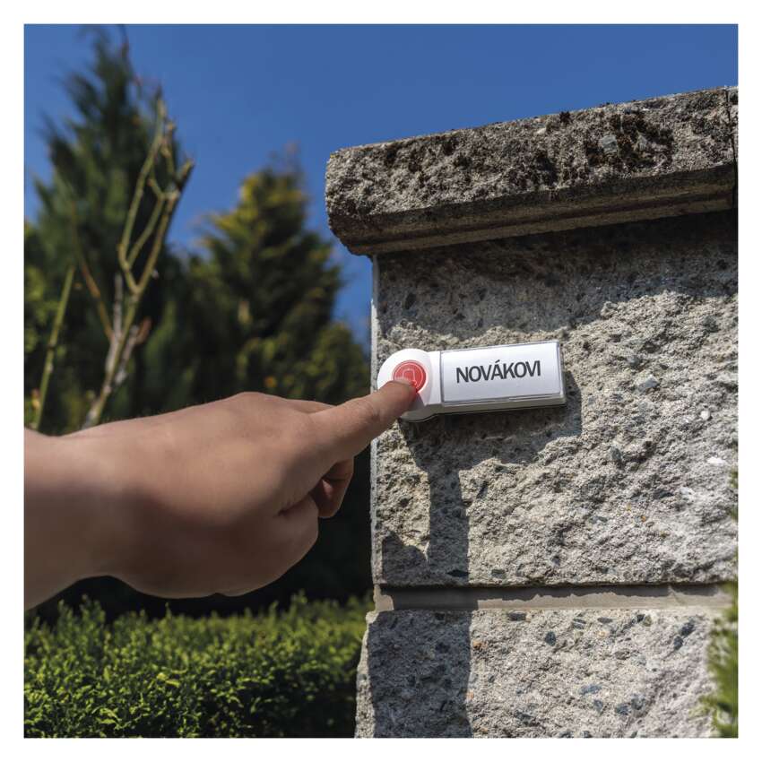 A vezeték nélküli nyomógomb bírja az esőt és a havat is. Megbízhatóan működik kültéren, és teljes szabadságot biztosít az elhelyezésben.