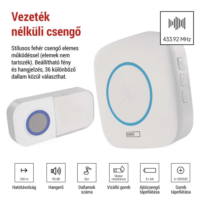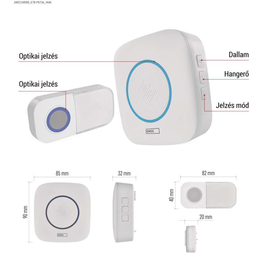 Az EMOS P5736 vezeték nélküli csengő tiszta, elegáns megjelenésével minden belső térbe tökéletesen illeszkedik. A kompakt vevőegységet könnyen elhelyezheti bárhol a lakásban vagy házban, míg a gomb időjárásálló (IP55). A praktikus fényjelzés ráadásul gondoskodik arról, hogy zajosabb környezetben is tudjon a látogatókról.