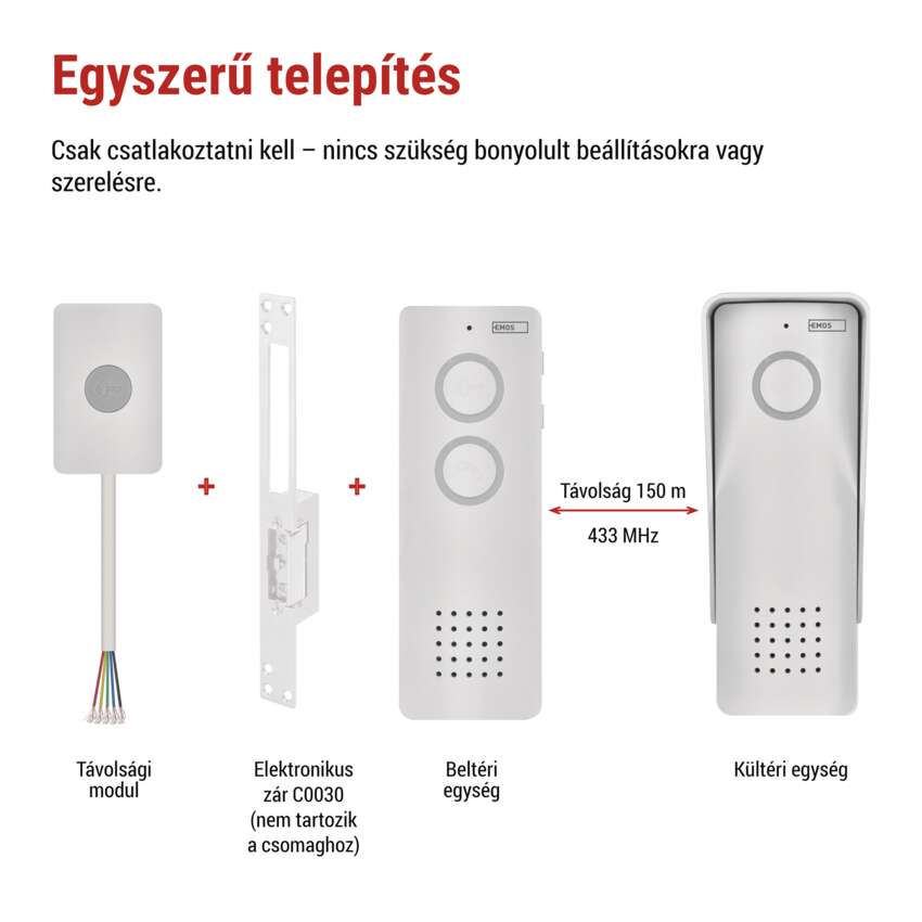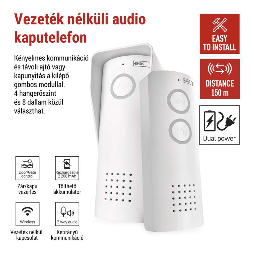 Élvezze a kényelmes kommunikációt és az ajtók vagy kapuk távoli nyitásának lehetőségét - csak csatlakoztassa a modult az elektronikus zárhoz (a zár nem tartozék). A modul tartalmaz egy praktikus kilépőgombot is. A vízálló kültéri egység akár 150 m-es hatótávolságot biztosít, így mindig számíthat rá. Ezen kívül a rendszer bővíthető 1 kültéri és 2 beltéri egységgel.
