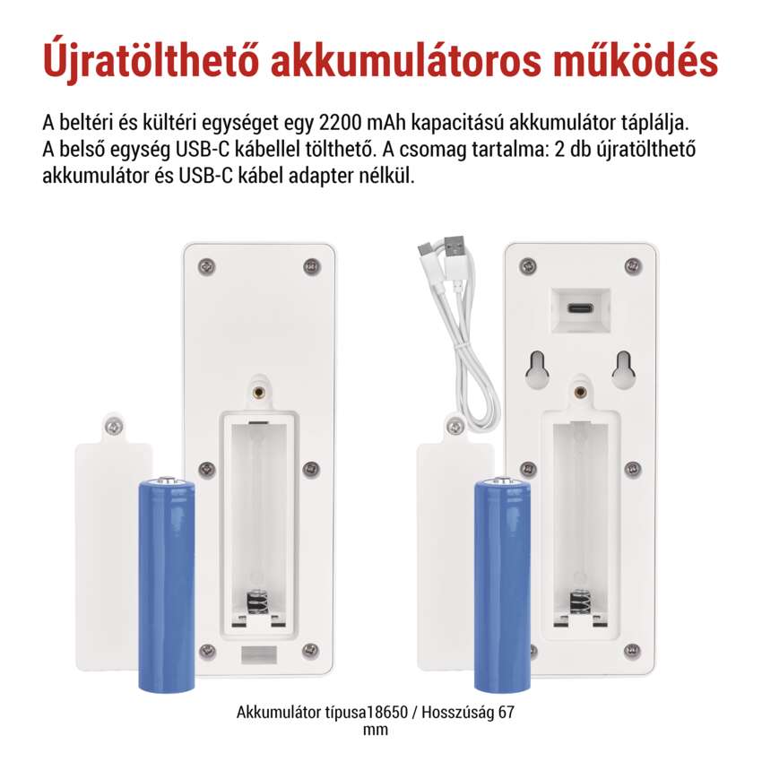 A kültéri és a beltéri egységet egyaránt 2.000 mAh-s újratölthető akkumulátorral (2 db mellékelve) látja el . Van egy alacsony töltöttségi szint jelző és egy praktikus USB-C töltőkábel, amely szintén a csomag részét képezi. A telepítés a lehető legegyszerűbb - csak csatlakoztassa és kezdje el használni.