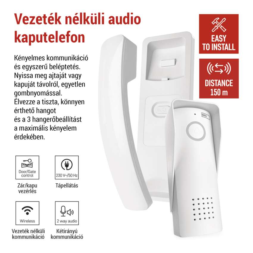 Élvezze a kényelmes kommunikációt és a távolról történő ajtó vagy kapunyitás lehetőségét - csak csatlakoztassa a kültéri egységet egy elektronikus zárhoz (a zár nem tartozék). A vízálló kültéri egység akár 150 m hatótávolságot biztosít, így mindig számíthat rá. A készlet ráadásul bővíthető további egységekkel, legfeljebb 10 egységig (kültéri és beltéri egység együttesen).